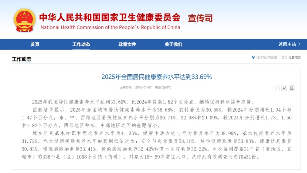 2025年我国居民健康素养水平达到33.69%,比2024年提高1.82个百分点,继续保持稳步提升态势。