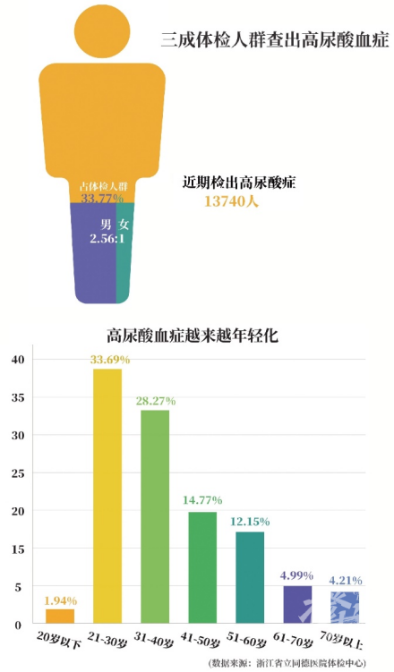 据报道,浙江一家医院肾病风湿科医生表示,连日来,每天接诊将近20名高尿酸血症和痛风患者,其中九成是男性。此外,在他们医院体检的4万多名体检人员,其中检出高尿酸13740人,占体检人群百分比33.77%,