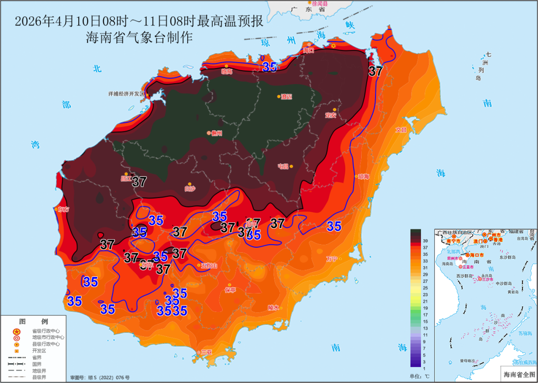 海南省气象局2026年04月10日09时50分继续发布高温三级预警:预计4月10日白天,海口、澄迈、临高、定安、屯昌、儋州、白沙、昌江和东方等9个市县的大部分乡镇将出现37摄氏度以上的高温天气,其中昌江、白沙、儋州、临高和澄迈部分乡镇气温可达40摄氏度以上,请有关单位做好防暑降温、森林防灭火等相关工作。
